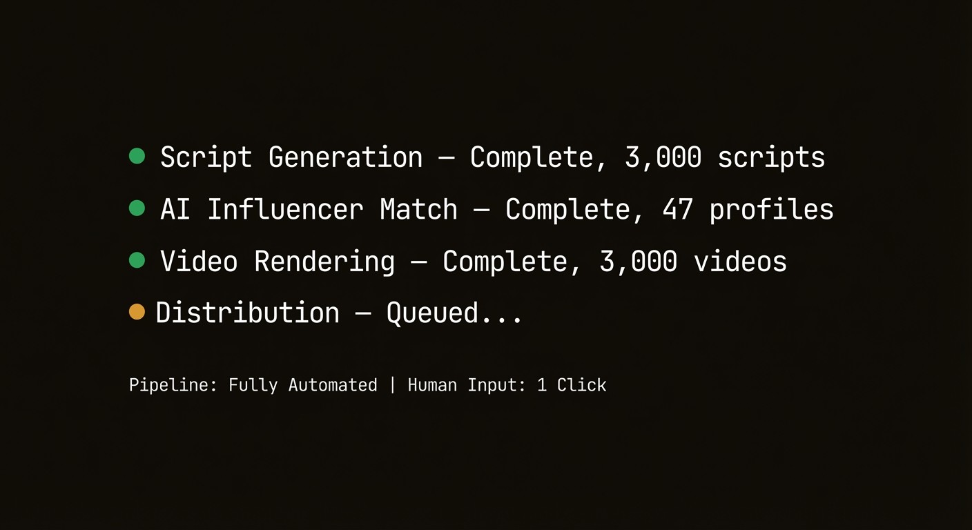 Manual production: 50 videos/month max. Our AI army: 3,000+. 60x output, zero headcount.