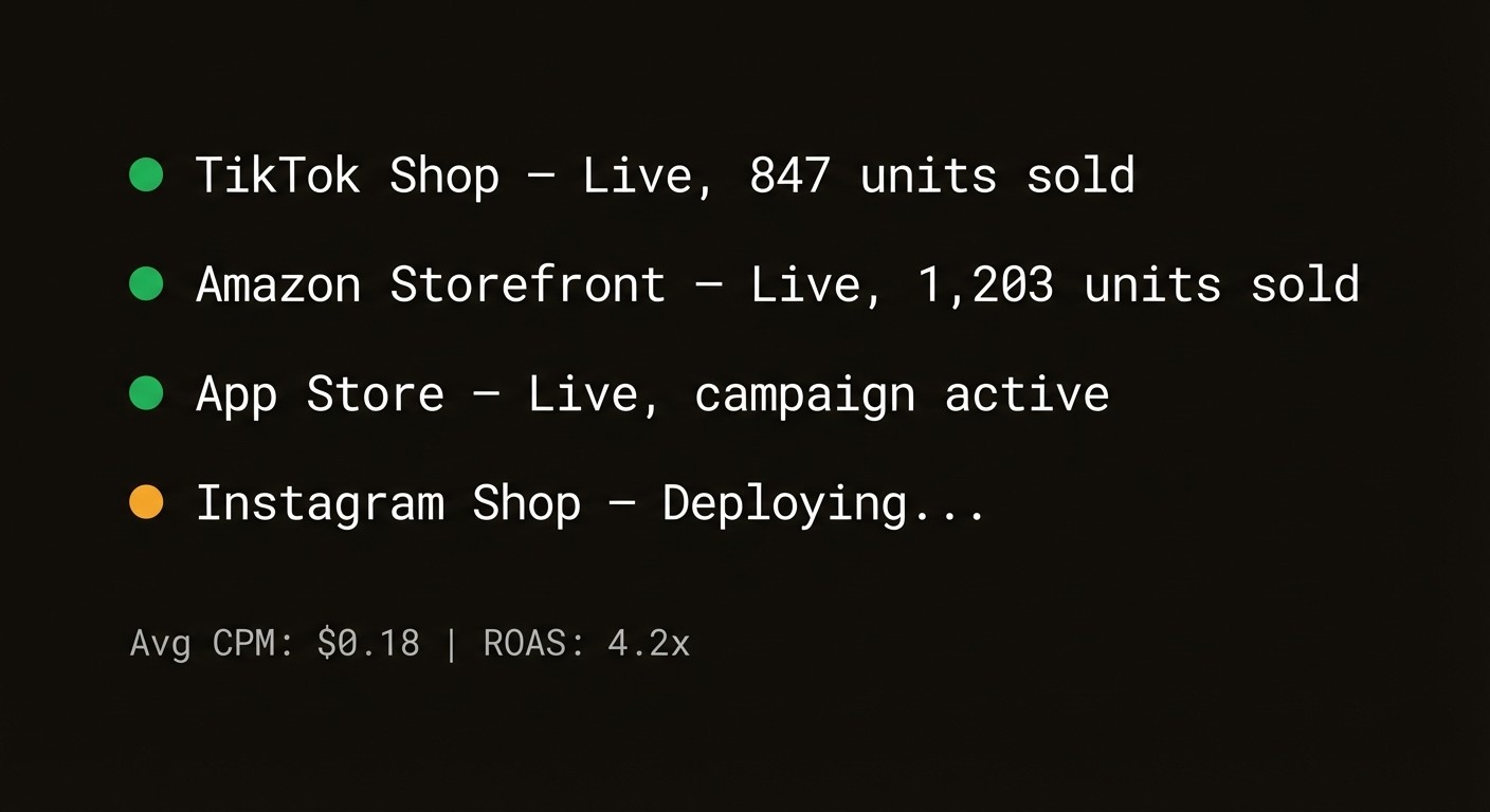 Content hits TikTok Shop, Amazon, App Store, everywhere. You sell. <$0.20 CPM.